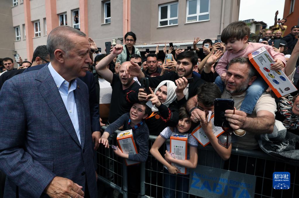 5月14日,在土耳其伊斯坦布爾,現任總統埃爾多安在一處投票站外向支持者致意。