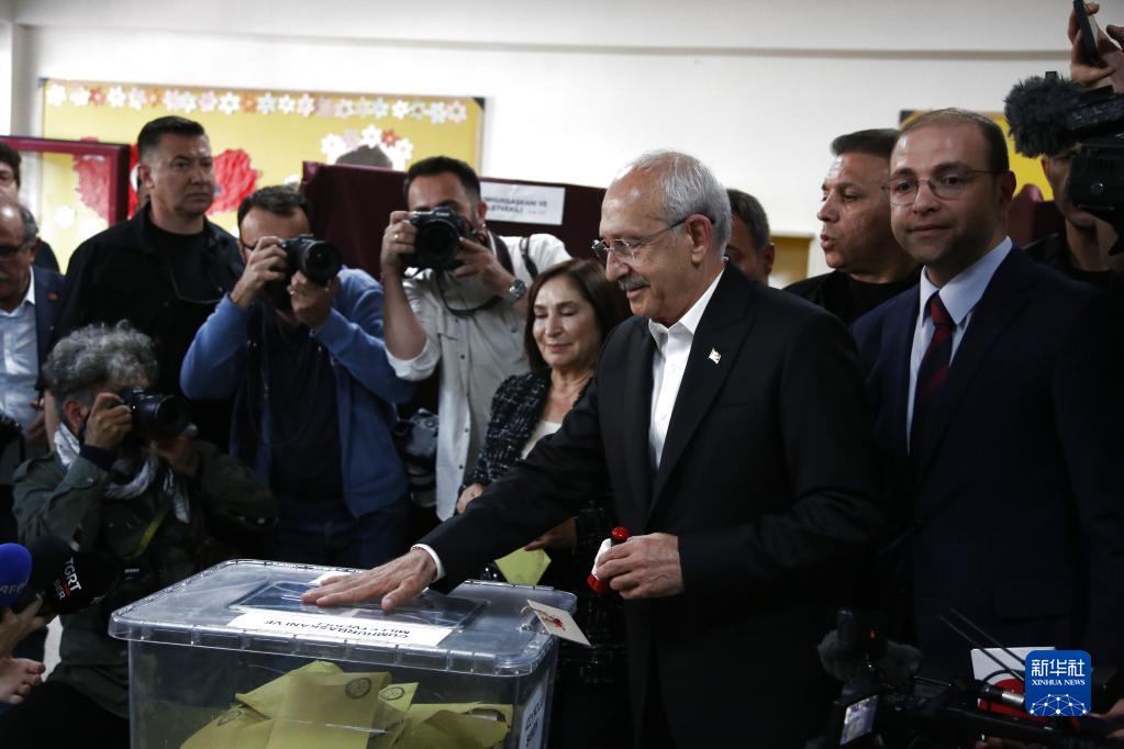 5月14日,在土耳其安卡拉,由6個反對黨組成的“民族聯盟”陣營候選人凱末爾·克勒奇達爾奧盧(中)在一處投票站投票。