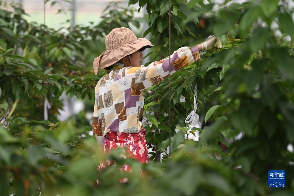 5月14日,農戶在桐廬縣莪山畬族鄉塘聯村“水果共富工坊”內對大櫻桃進行修枝養護。
