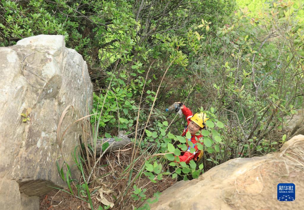 5月14日,張家界市武陵源區山地應急救援隊隊員在叢林中撿拾垃圾。