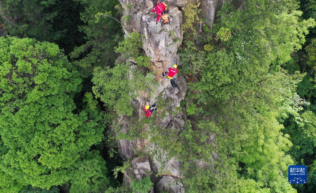 5月14日,張家界市武陵源區山地應急救援隊隊員系上繩索在懸崖峭壁間撿拾垃圾(無人機照片)。