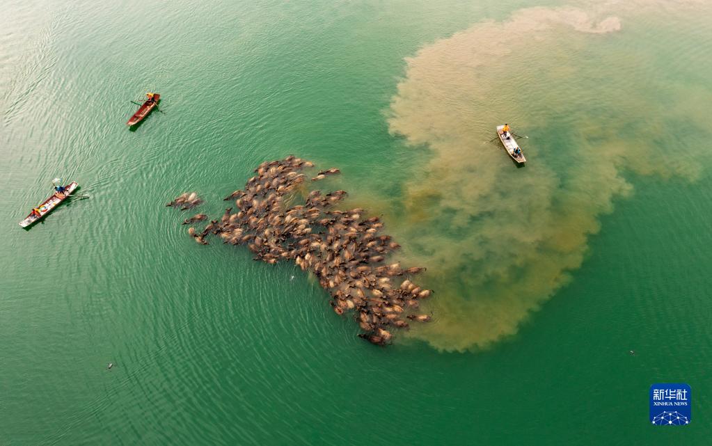 5月13日,在南充市蓬安縣相如鎮油房溝村嘉陵江段,成群結隊的水牛渡江(無人機照片)。