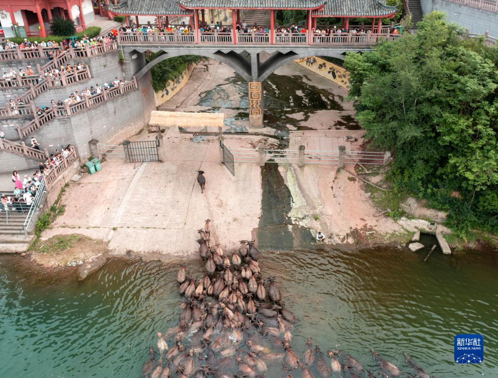 5月13日,在南充市蓬安縣相如鎮油房溝村嘉陵江段,游客觀看牛群渡江上岸(無人機照片)。