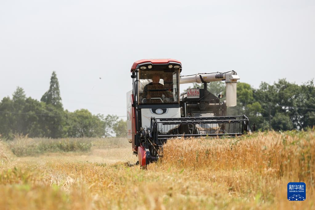 5月14日,農民在浙江省湖州市德清縣新安鎮收割小麥。