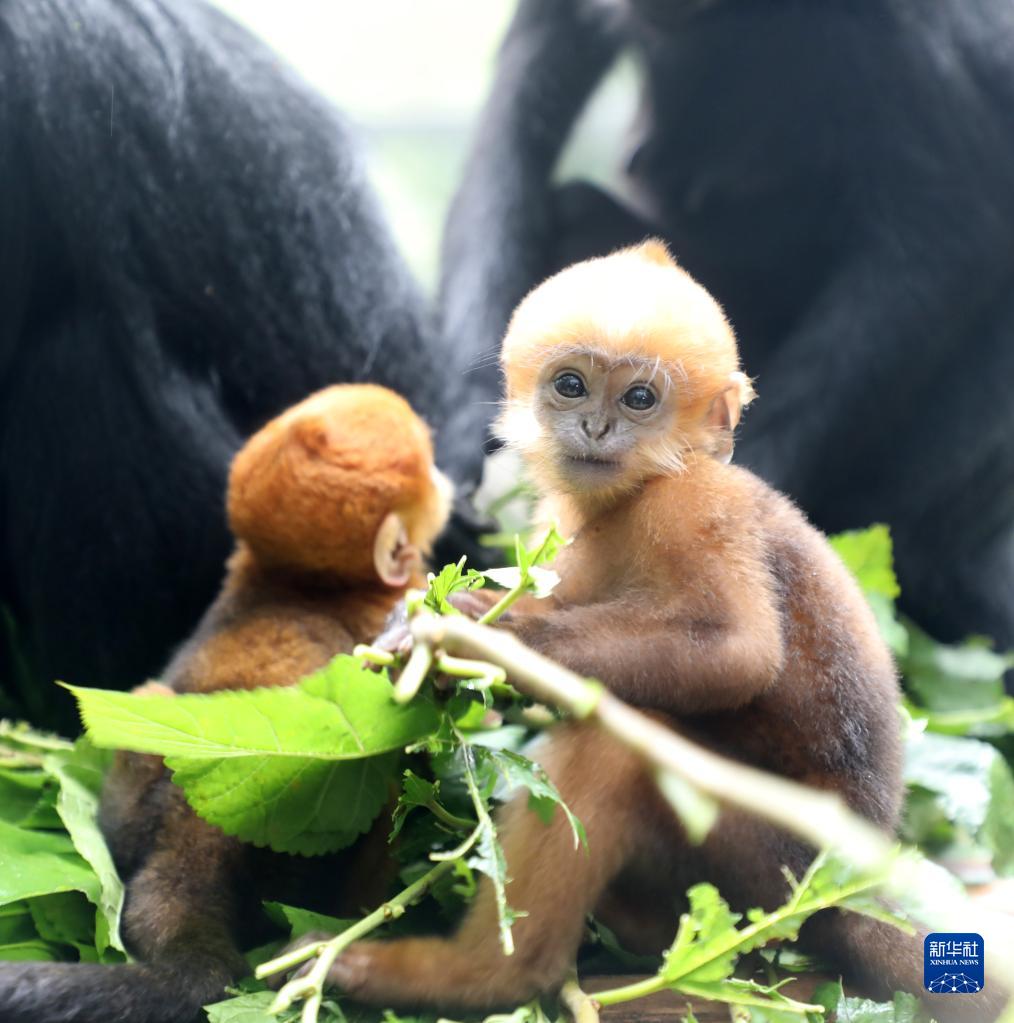 今年以來,廣州長隆野生動物世界成功繁育兩只黑葉猴寶寶“想你”和“花園”。黑葉猴母猴“歡歡”“美美”分別于3月30日與5月5日產下雄性寶寶“想你”和“花園”。剛出生的黑葉猴寶寶全身呈金黃色,兩三個月后就會逐漸變成黑色。