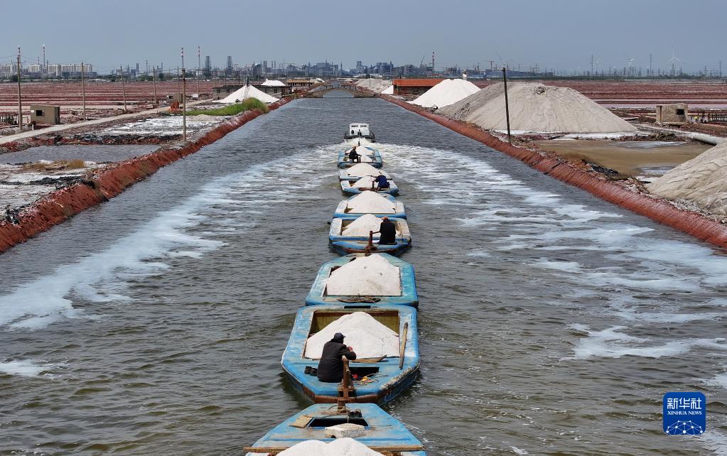 5月14日,唐山市曹妃甸區南堡鹽場的工人在將收獲的春鹽運出鹽場(無人機照片)。