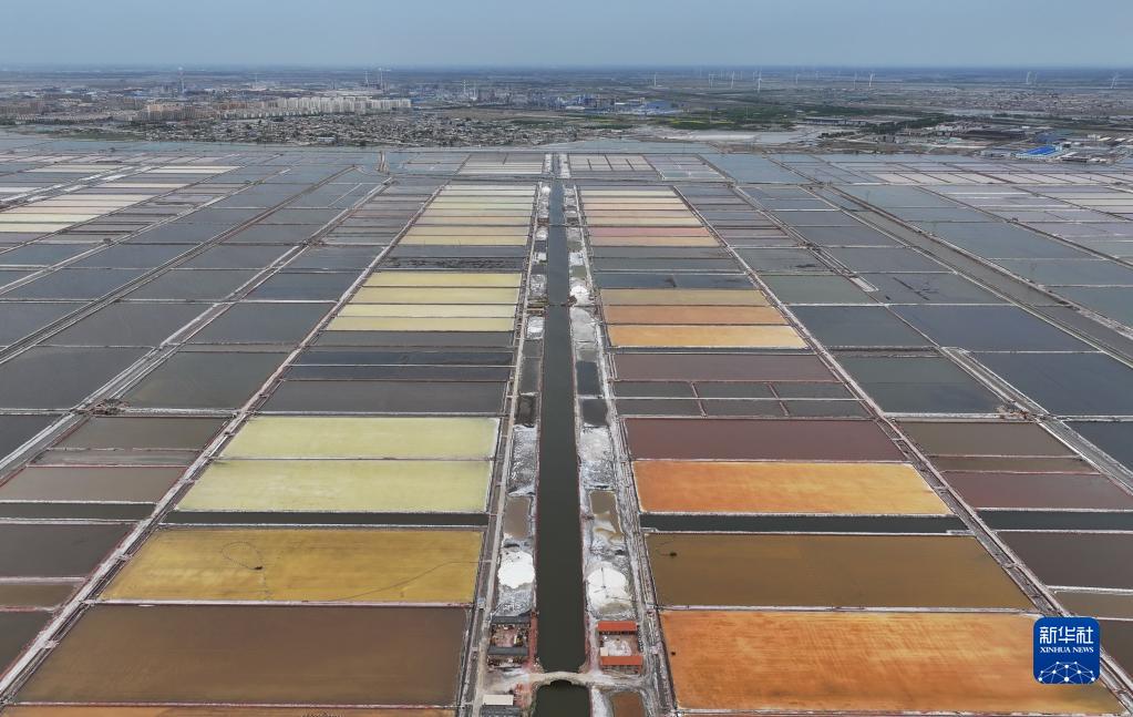 5月14日,唐山市曹妃甸區南堡鹽場的工人在鹽田內使用機械設備收獲春鹽(無人機照片)。