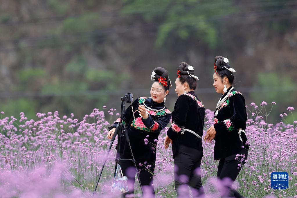 5月13日,游客在貴州省黔東南苗族侗族自治州凱里市三棵樹鎮巴拉河畔賞花。