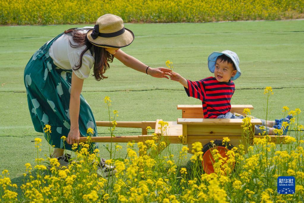 5月14日,在河北省遵化市一處油菜花海景區,一位母親帶孩子參加親子活動。