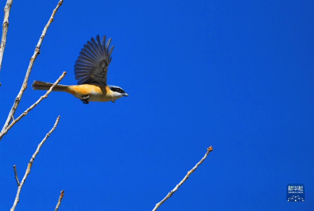 灰背伯勞在拉薩市城關區蔡公堂街道次角林村上空飛過(5月14日攝)。