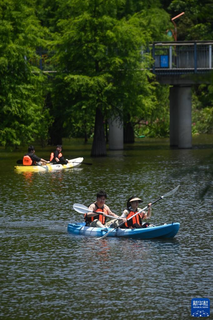 5月15日,游客劃著皮劃艇在杭州市臨安區青山湖國家森林公園游覽。