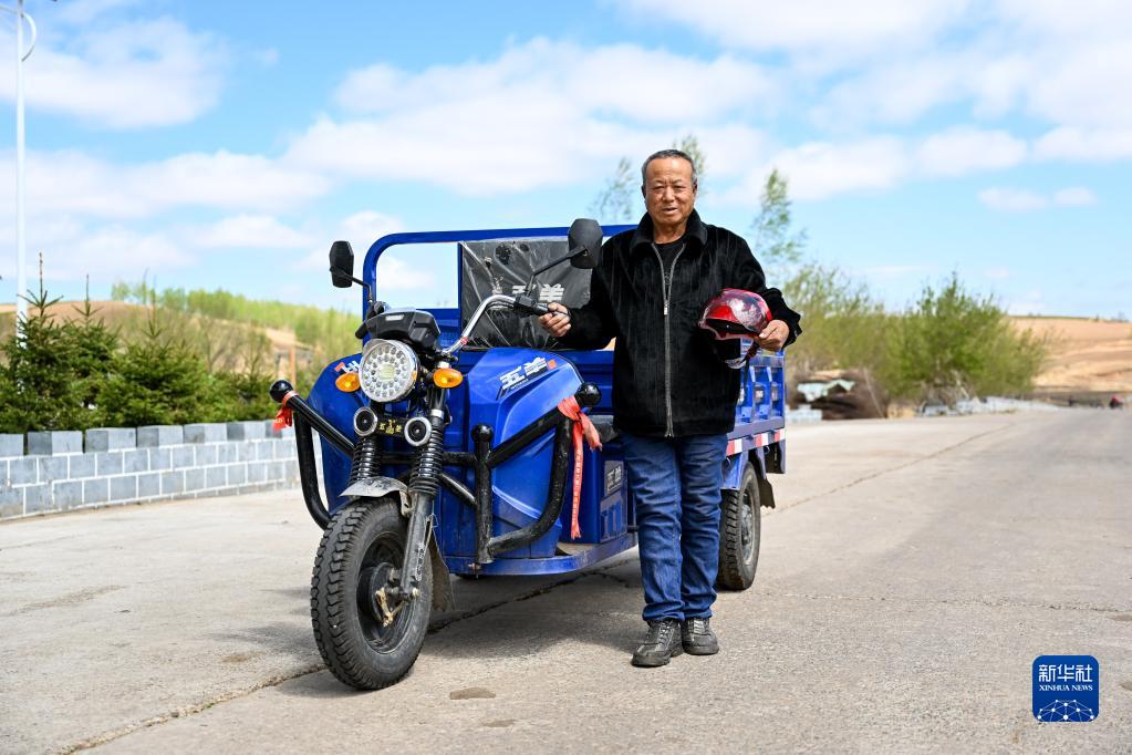這是5月13日拍攝的于慶柱與他運送快遞的三輪車的合影。