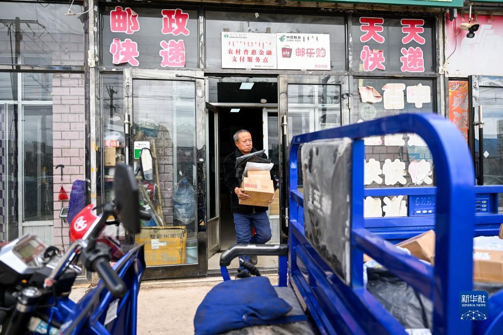 5月13日,在阿榮旗紅花梁子社區快遞驛站,于慶柱將快遞搬上三輪車。