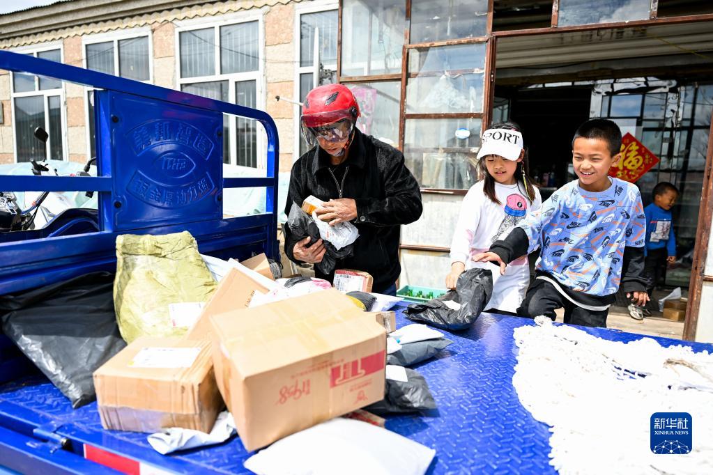 5月13日,在阿榮旗孤山屯村,于慶柱與小朋友一起卸快遞。