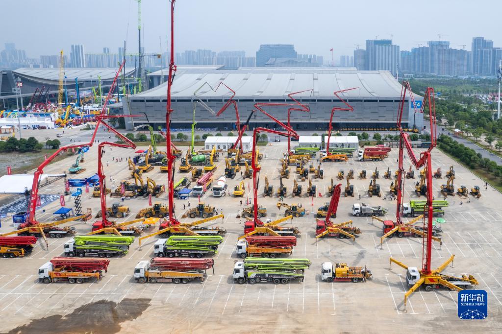 這是5月15日在長沙國際會展中心拍攝的第三屆長沙國際工程機械展覽會戶外展區(無人機照片)。