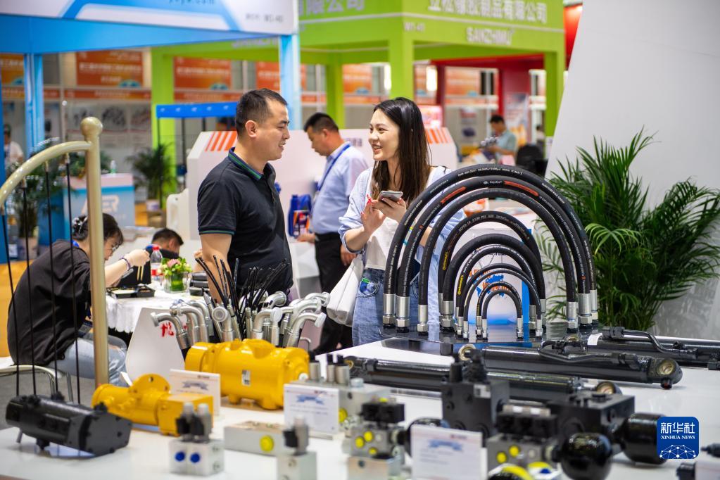 5月15日,在長沙國際會展中心,觀眾(右)了解展出的工程機械配件。