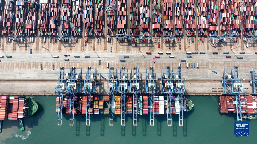 山東港口青島港全自動化碼頭進行裝卸作業(5月14日攝,無人機照片)。