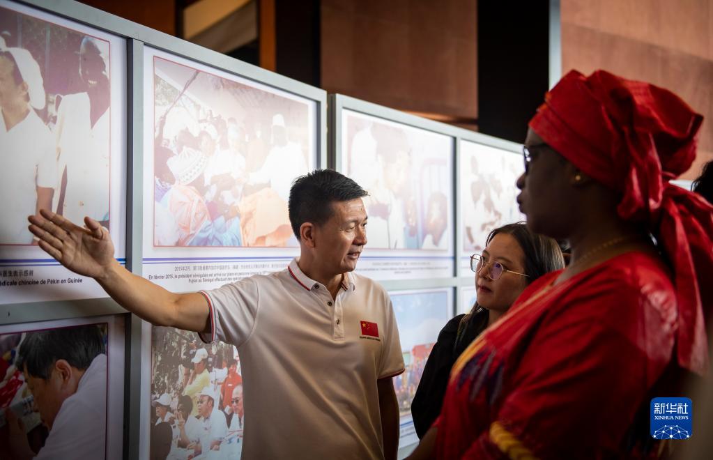 5月14日,在塞內加爾首都達喀爾舉辦的中國醫療隊派遣60周年圖片展上,中國第19批援塞內加爾醫療隊隊長吳啟明(左一)介紹展出圖片。