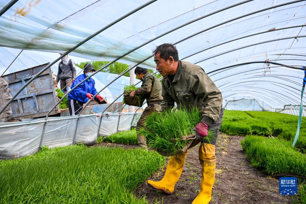 5月15日,農民在育秧棚中搬運秧苗。