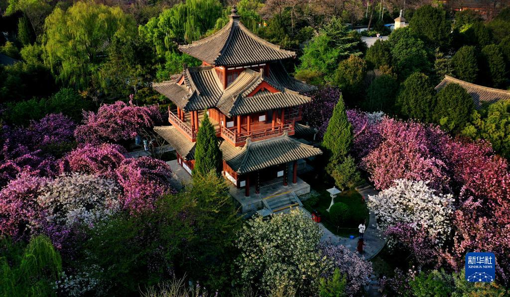 西安青龍寺遺址景區內櫻花盛開(3月31日,無人機照片)。