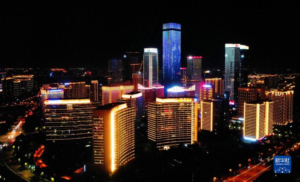 西安高新區都市之門區域夜景(4月30日攝,無人機照片)。