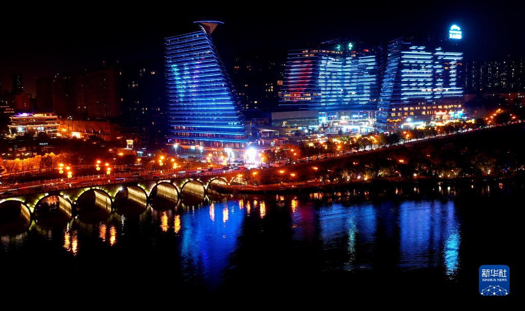 西安曲江南湖夜景(4月19日攝,無人機照片)。