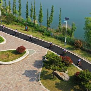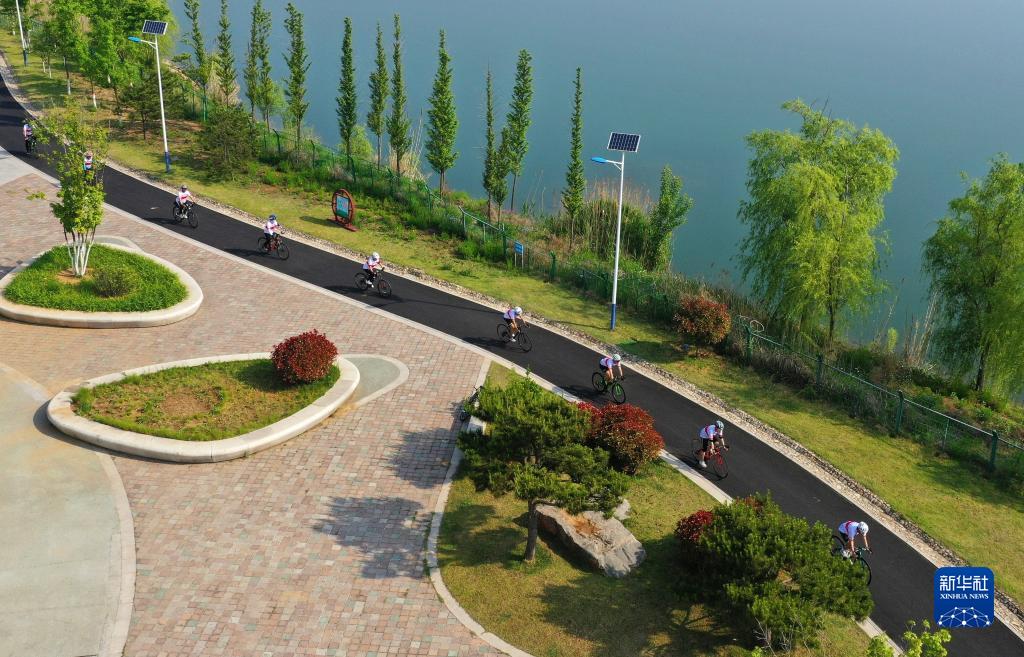5月14日,市民在青島市即墨區環秀街道一個公園騎行(無人機照片)。