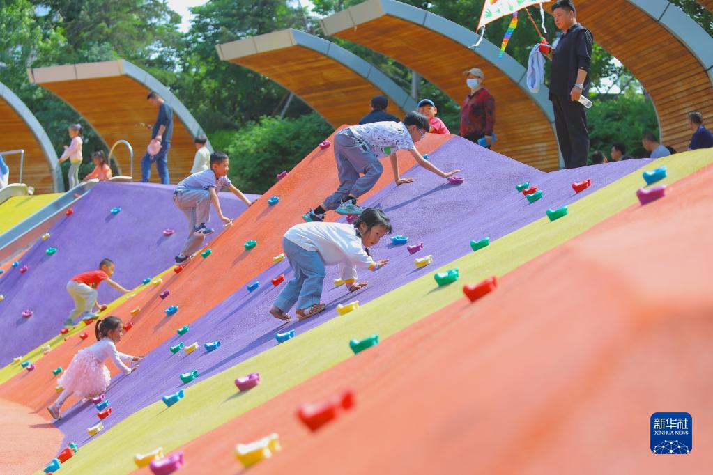 5月14日,小朋友在青島市即墨區通濟街道一個公園玩耍。