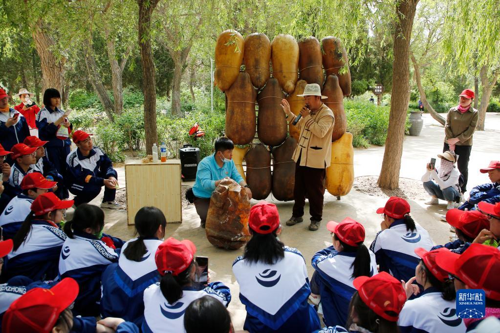 5月14日,學生在中衛市沙坡頭區學習羊皮筏子制作工藝。
