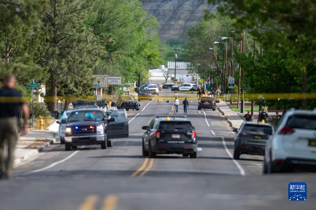 這是5月15日在美國新墨西哥州法明頓市拍攝的槍擊事件現場。