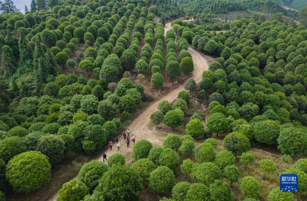 5月14日,李秀雄一家和工人走在四川省榮縣東興鎮長興林場(無人機照片)。