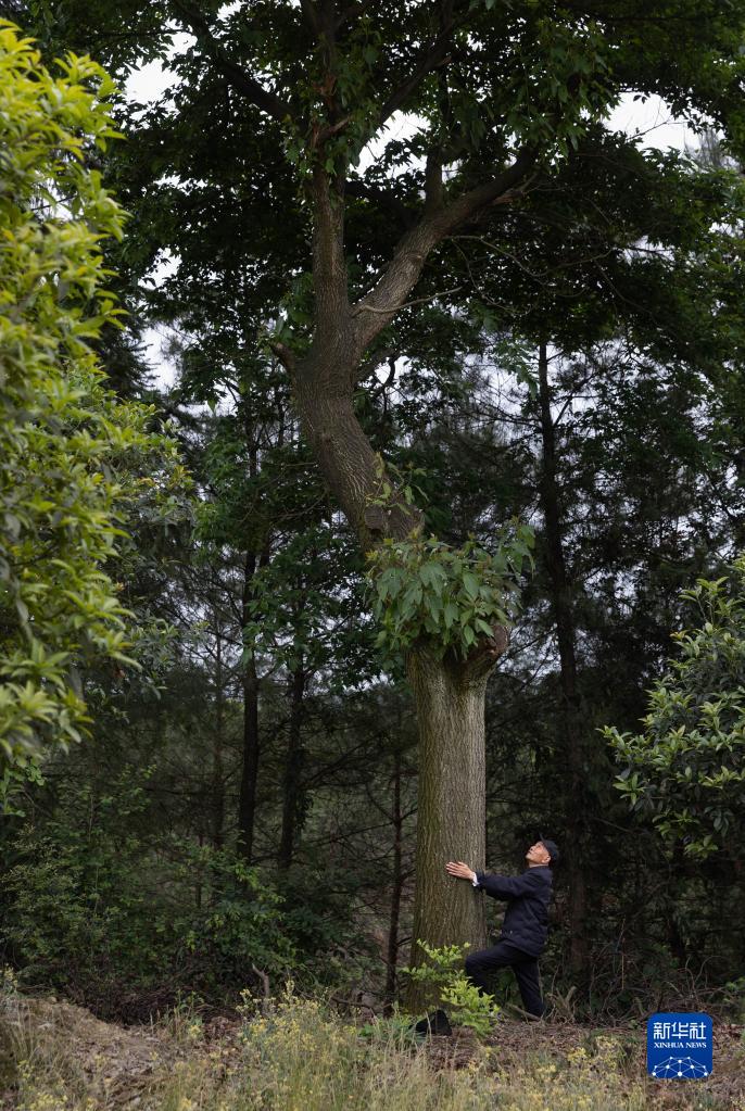5月14日,在四川省榮縣東興鎮長興林場,李秀雄抱著一棵粗壯的檫樹,這是他最初種樹時候移栽的。