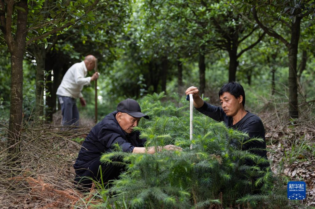 5月14日,在四川省榮縣東興鎮長興林場,李秀雄(中)和工人在苗圃中觀測樹苗生長情況。