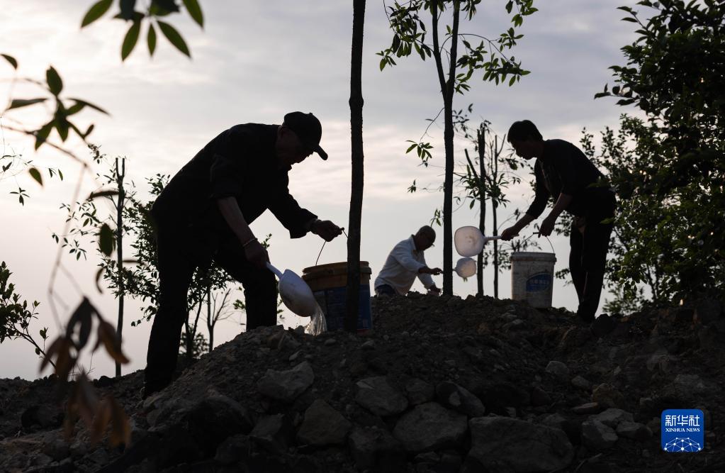 5月14日,李秀雄(左)在四川省榮縣東興鎮長興林場一處山坡給桂花樹苗澆水。