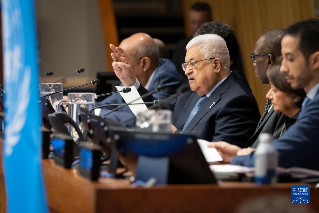5月15日,巴勒斯坦總統阿巴斯(中)在聯合國巴勒斯坦人民行使不可剝奪權利委員會高級別會議上致辭。