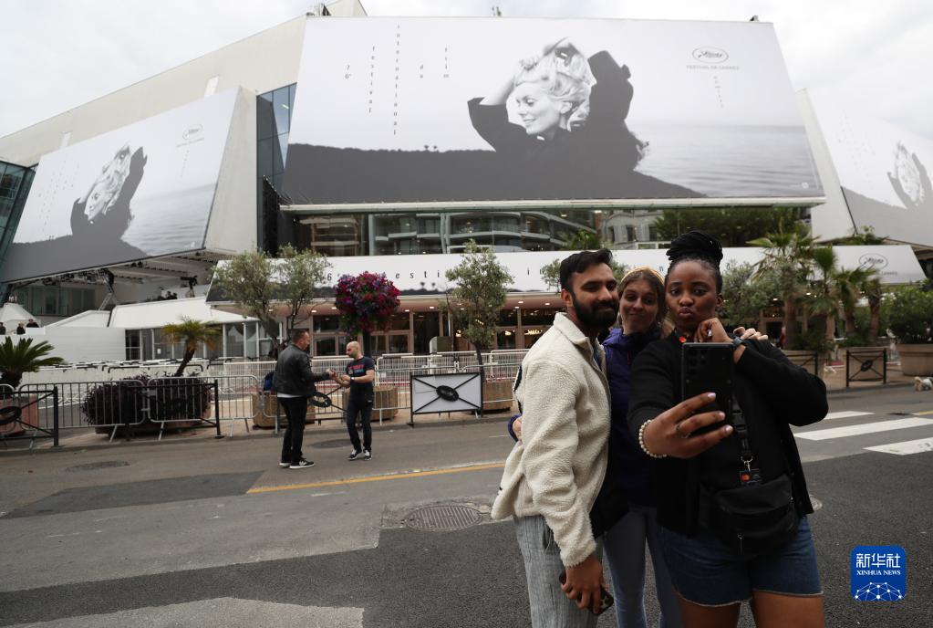 5月15日,在法國南部海濱城市戛納,人們在電影宮外的戛納國際電影節海報前自拍。