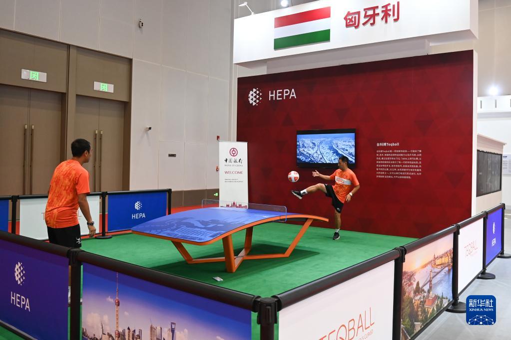 5月16日,在中東歐展館匈牙利館,運動員在展示臺科搏運動。這是起源于匈牙利的桌式足球運動。