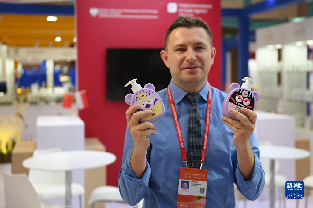 5月16日,在中東歐展館,企業代表在展示來自波蘭的日用消費品。