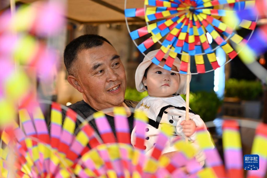 5月14日,市民在山東省青島市即墨古城的夜市上選購風車。