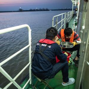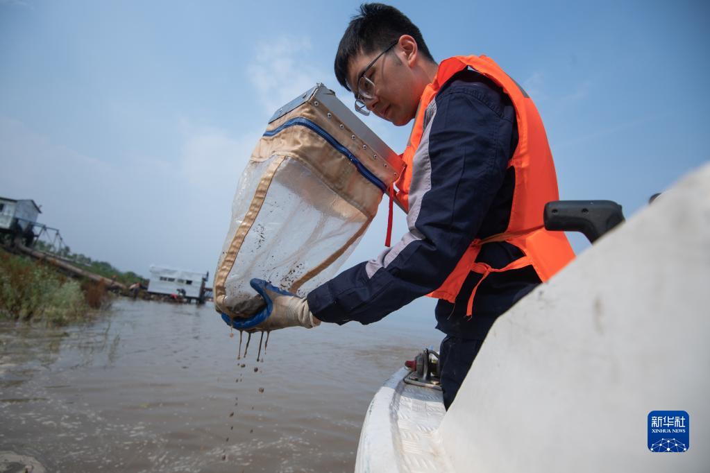 5月11日,監測人員熊少凱在武漢漢南區江段進行底棲動物樣品采集。