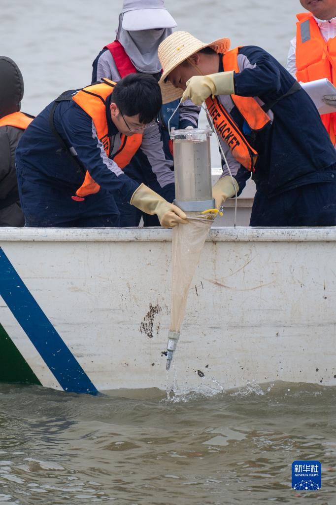 5月13日,監測人員熊少凱(左)、韓堂瑞在采集浮游動物樣本。