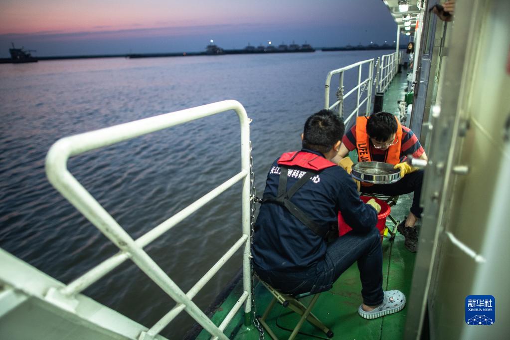5月12日,監測人員熊少凱(后)、韓堂瑞在篩洗采集到的底棲動物樣品。