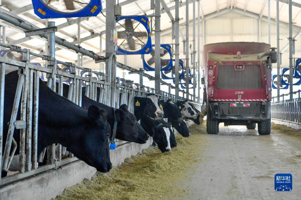 5月15日,在天津天食智慧牧場牛舍內,一輛飼喂投運車為奶牛添加混合飼料。