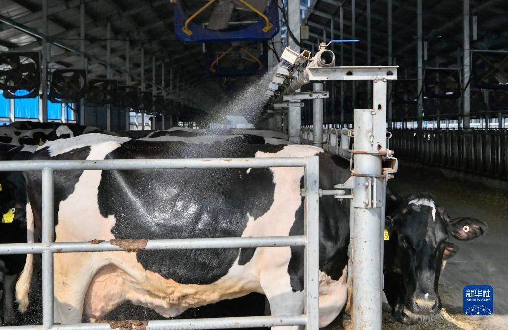 5月15日,在天津天食智慧牧場牛舍內,傳感器根據溫濕度數據,啟動自動噴淋設施降溫。