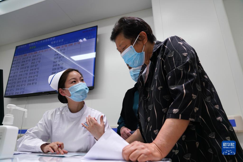 5月16日,在江蘇省鎮江市潤州區黎明社區衛生服務中心家庭醫生工作室,護士解答患者問題。