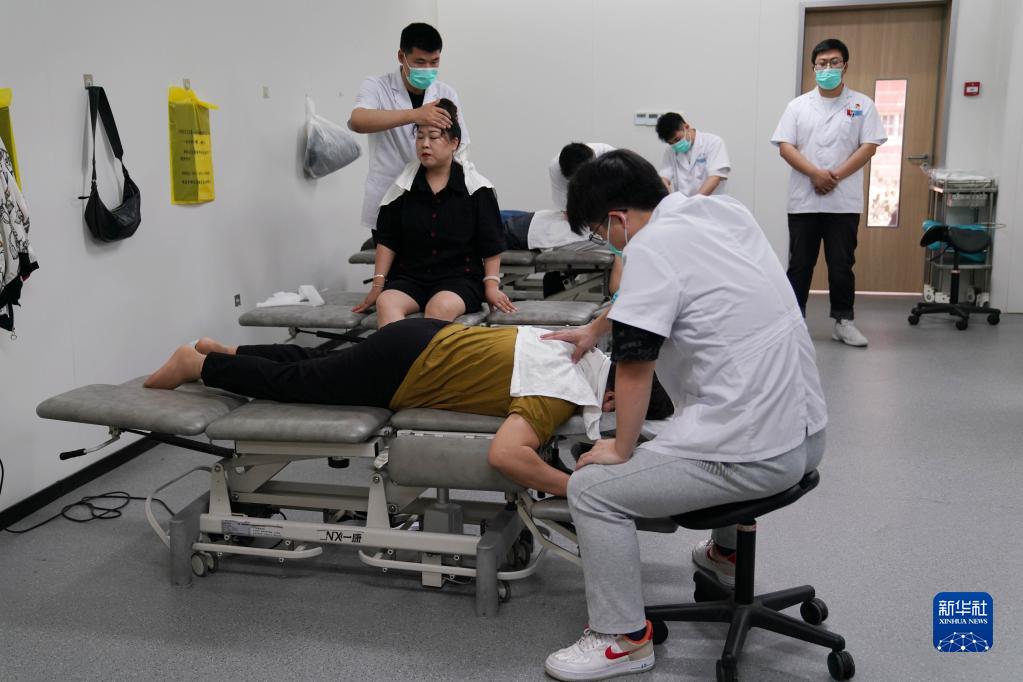 5月16日,在江蘇省鎮江市潤州區黎明社區衛生服務中心針灸推拿科,醫務人員為患者進行推拿治療。