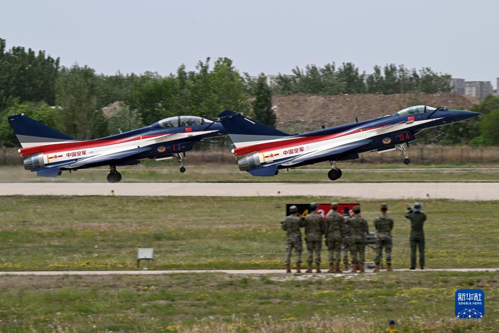 空軍八一飛行表演隊殲-10C(右)和殲-10S(左)表演機編隊起飛,開展訓練(5月6日攝)。