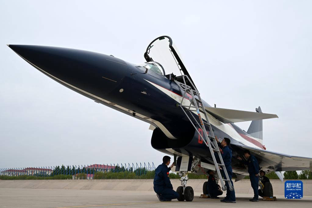 空軍八一飛行表演隊的地勤人員在維護殲-10C表演機(5月6日攝)。