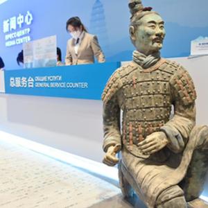 這是中國-中亞峰會新聞中心總服務臺旁的兵馬俑擺件(5月16日攝)。
