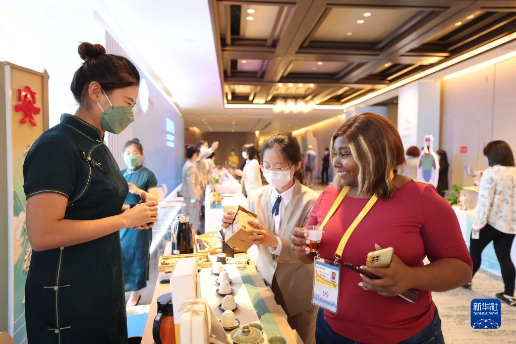 5月16日,來自蘇里南電視基金會的一位記者(右)在中國-中亞峰會新聞中心體驗中國傳統文化。